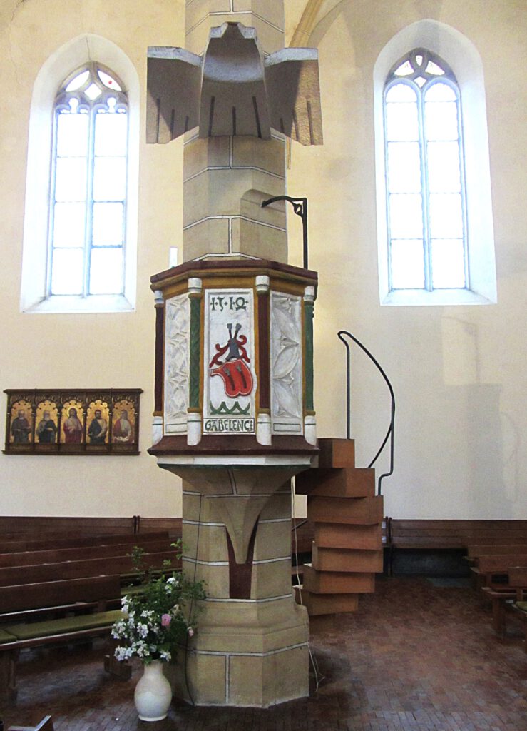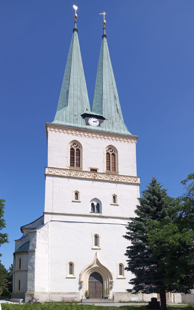 Sie stehen hier vor der Kirche Göda an der Ausgangstafel zum Pětr-Młónk-Gedenkweg.